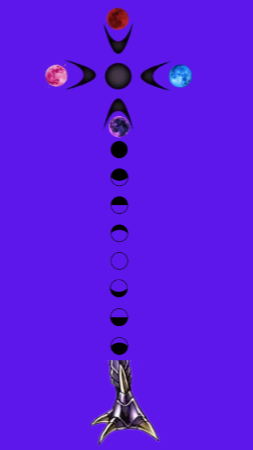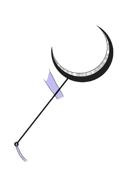 the scythe is a cresatcent moon side way down and on the stick of the blade are the cyclyes of the moon on the other side it has colors of the different moons these are stronger named attacks